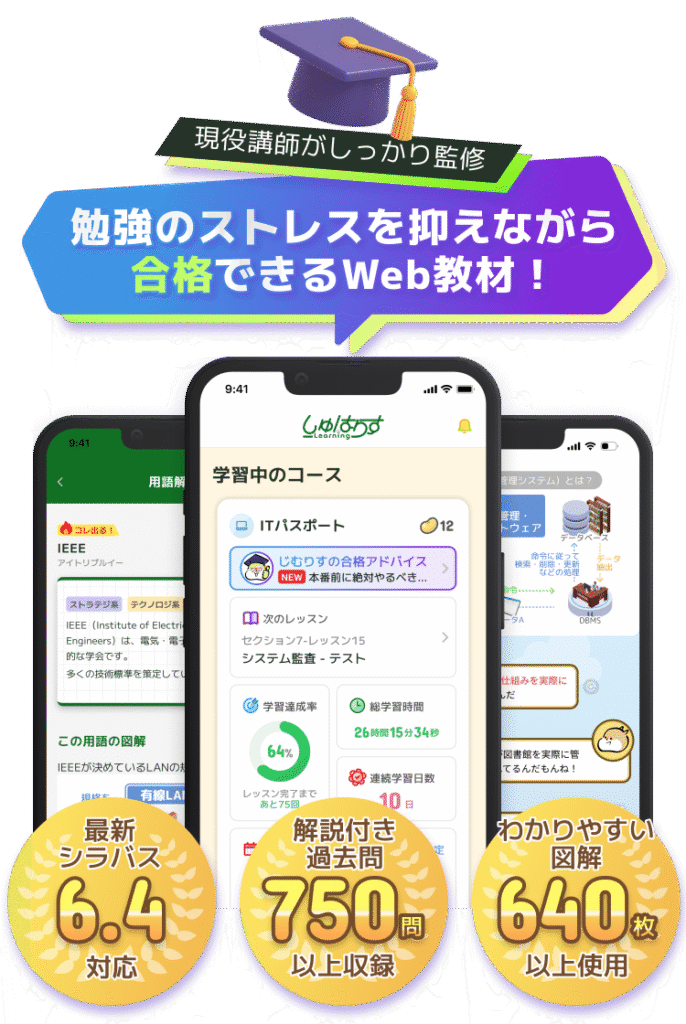 試験の傾向はもちろん、多くの学習者がつまずきやすいポイントに絞って設計されたITパスポート教材なので、限られた時間を使って効率よく学習することができます。