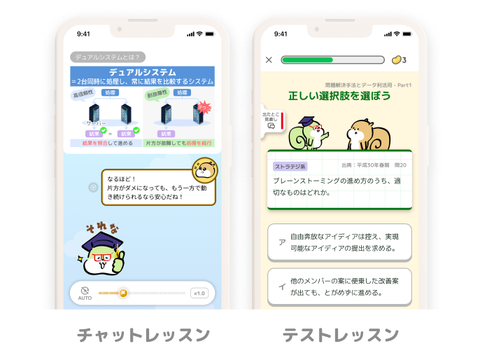 キャラクターと一緒に、オリジナル図解たっぷりのチャット風レイアウトの「チャットレッスン」と、過去問を使った「テストレッスン」で、インプットとアウトプットを交互に学んでいきます。