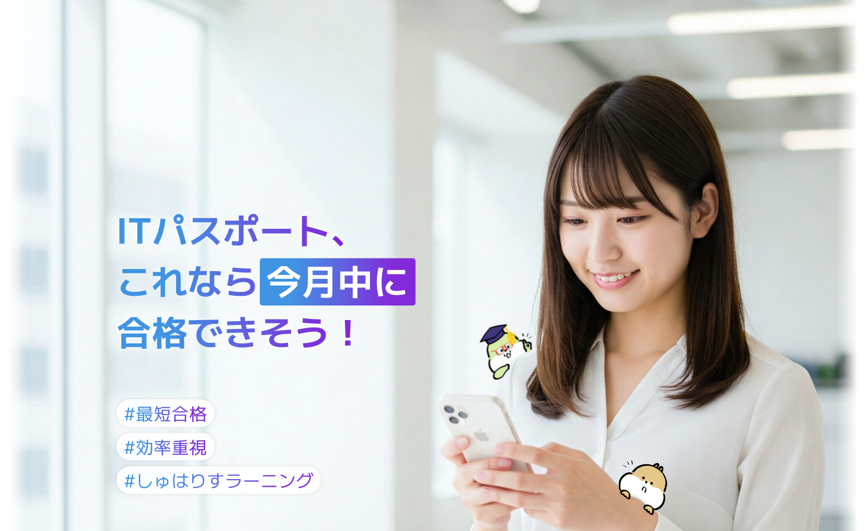 しゅはりすラーニング は、年間応募者30万人以上の今注目の国家資格「ITパスポート」を “取らなきゃいけない” 方のために設計されたオンライン学習サービスです。