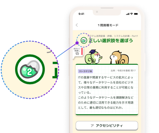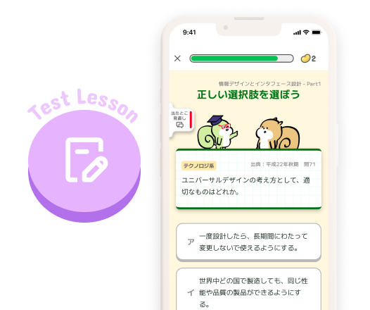 キャラクターと一緒に、オリジナル図解たっぷりのチャット風レイアウトの「チャットレッスン」と、過去問を使った「テストレッスン」で、インプットとアウトプットを交互に学んでいきます。