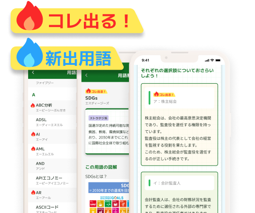 「用語集」や「テストレッスン」、「セクションテスト」、「過去問フル」の解説画面についている炎マークの「コレ出る!」&「新出用語」アイコンは要チェック!