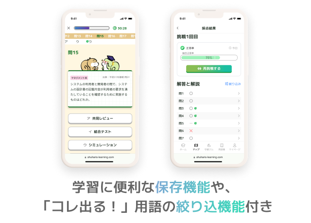 不正解した問題や、「見直す問題」にチェックを入れた問題だけを絞り込むこともできるので、試験直前の見直しにも役立ちます。