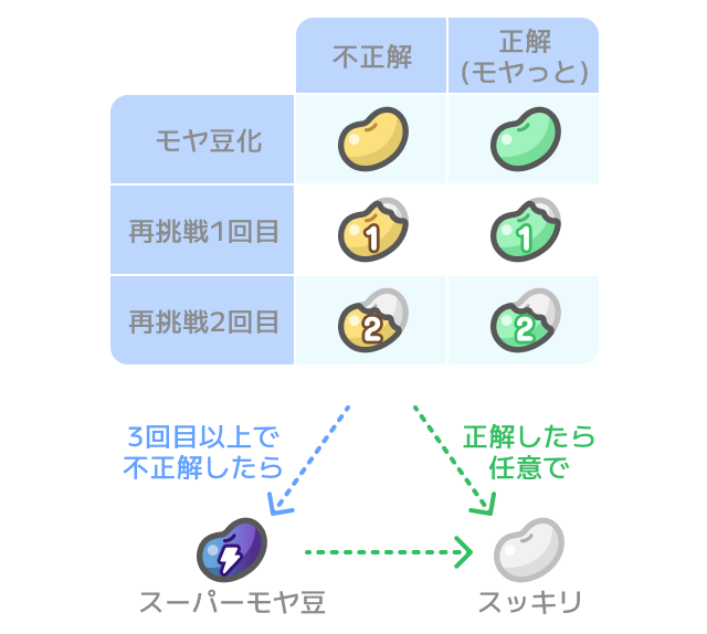 3回挑戦しても正解できなかった場合は特に苦手な問題として、「スーパーモヤ豆」に進化するので重点的に挑戦してみましょう。