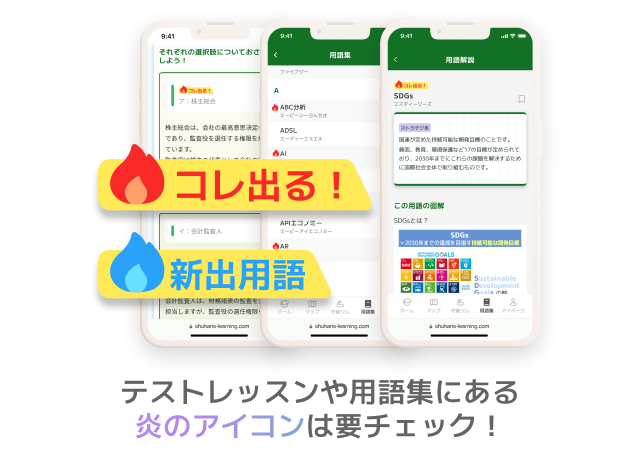 チャットレッスンで使用した図解も挿入されているのでわかりやすく、さらに、よく出る用語の選択肢には「これ出る!」アイコンが表示されるので、要点を効率よく確認することができます。